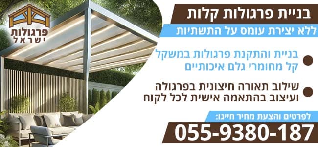 אנחנו בכל מקרה מספקים פרגולות איכותיות במחירים אטרקטיביים במיוחד – מוזמנים לפנות אלינו, חברת פרגולות ישראל, ולקבל הצעת מחיר מותאמת אישית אליכם וייעוץ מועיל, בלי התחייבות מצדכם.