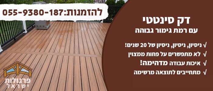 אם אתם מחפשים חופש בחירה מוחלט ותוצאות שירצו אתכם, אל תתפשרו והזמינו דק סינטטי רק דרך חברת פרגולות ישראל. תמצאו שלל גוונים ועיצובים של דקים סינטטיים והכל במחירים נוחים ומשתלמים – כולל התקנה. אצלנו תשלמו על דק סינטטי מחיר למטר שמתחיל מ-500 ₪, ואתם מוזמנים כבר עכשיו להתקשר ולקבל הצעת מחיר מדויקת בטלפון, ללא התחייבות.